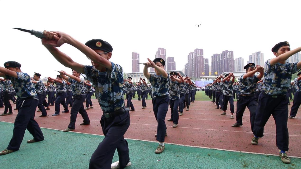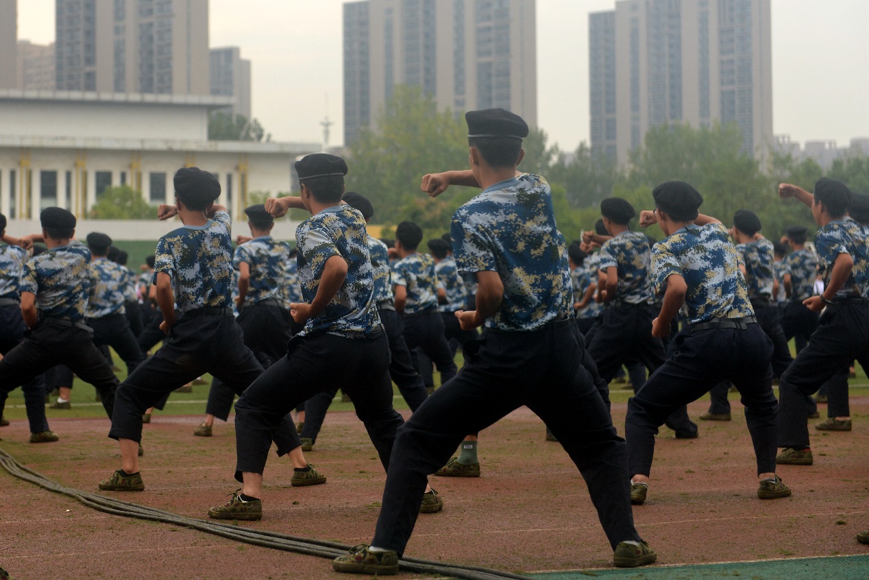 在振奋人心的《阅兵进行曲》中,男子拳术方阵开始表演。拳打、脚踢、摔打……“天行健,君子以自强不息;地势坤,君子以厚德载物”,他们喊着响亮的口号,他们出拳虎虎生威,表演气势磅礴,引人入胜。军体拳打得呼呼作响,匕首操凛凛生光。每位学员英气逼人,击、刺、挑、剪、带……一招一式干净利落,霸气威武。