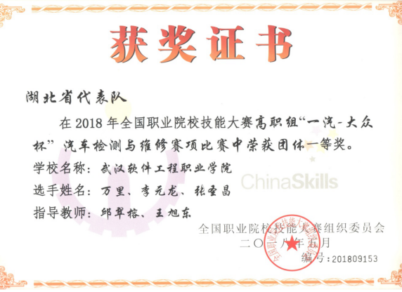 (通讯员 邱翠榕)5月28日,2018年全国职业院校技能大赛汽车检测与维修赛项在山东潍坊落下帷幕。我校汽车工程学院代表湖北省出征,万里、李元龙、张圣昌三名同学组成的代表队荣获团体一等奖。邱翠榕、王旭东两位指导老师荣获“优秀指导教师”称号。