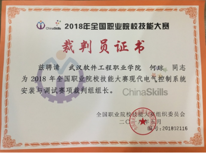 何琼教授是我校电子工程学院负责人,具备较高的专业技能水平和丰富的裁判经验。从2012年起,连续六年被聘为全国职业院校技能大赛(高职组)裁判、专家,2015年被教育部评为国赛优秀裁判员,在国内高职院校同行中有一定影响力。竞赛中她带领裁判团队严守竞赛纪律,秉公执裁,作风严谨,赛场秩序井然有条,确保了赛项公平、公正、安全、有序的进行,得到赛项执委会和参赛队的一致认可。