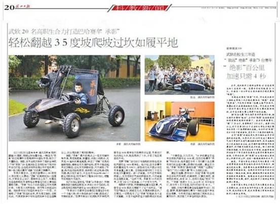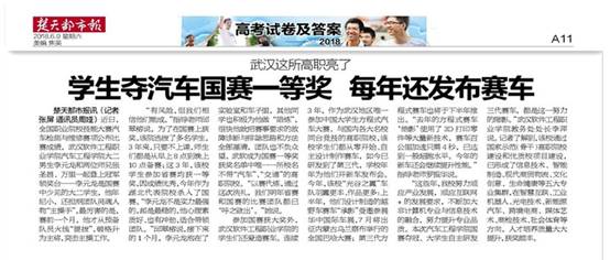 此前,6月1日,《长江日报》20版以“武软20名高职生合力打造巴哈赛车‘承影’,轻松翻越35度坡过坎如履平地”为题,半版报道我校学生三年造三台赛车的创新事迹;6月8日,《长江日报》18版再次科教头条,报道我校19岁小伙带队夺汽修国赛一等奖、武汉援疆教师带领学生首次闯进全国职院技能大赛、羽毛球达人玩转数学建模的创新实践活动,受到社会广泛好评。6月9日,《楚天都市报》在11版以“武汉这所高职亮了学生多汽车国赛一等奖每年还发布赛车”为题,报道我校汽车工程学院学子汽修国赛夺奖和爱造赛车的故事。