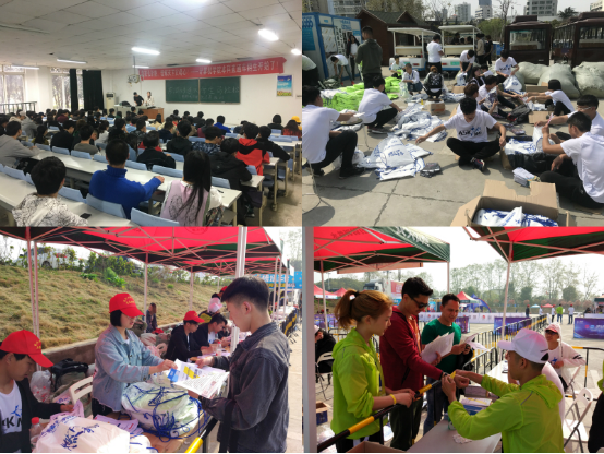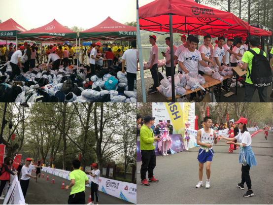比赛当天志愿者存取包、赛道分流、赛后补给、发放奖牌等工作场景