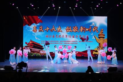 为庆祝党的十九大胜利召开,湖北省高校老年协会专门举行本次文艺汇演,我校离退休工作处和老年人艺术团非常重视,精心挑选和准备参演节目。舞蹈《美丽中国》以优美动听的旋律,激情奔放的舞蹈展现了我校700多名离退休老同志对党的十九大胜利召开的喜悦与祝福,体现了党的十八大以来人民群众日新月异的幸福生活。老年艺术团的演员们在舞台灯光的映衬下和着音乐翩翩起舞,红旗在舞台上高高飘扬,大家以这样的方式歌颂着这个时代,向新时代致敬!