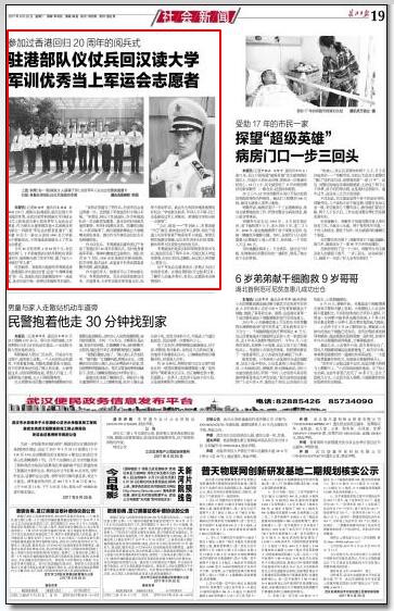 9月26日,《长江日报》社会新闻版以《驻港部队仪仗兵回汉读大学军训优秀当上军运会志愿者》为题对其进行了报道。