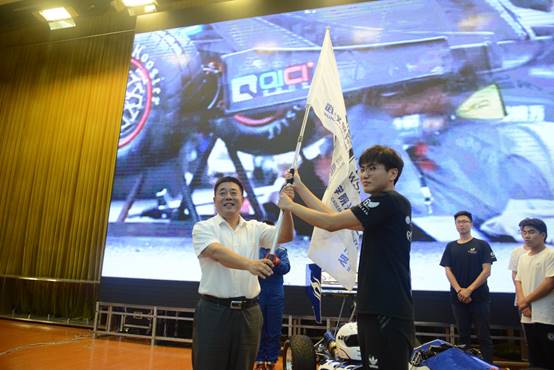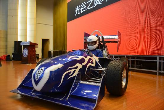 马蜂校长为“光谷之翼”车队授旗。他宣布,在党的十九大即将召开的重要时刻,在建设现代化、国际化、生态化大武汉和中国高等职业教育蓬勃发展的宏大背景下,我们一起见证凝聚着师生勤劳和智慧的新车“绝影”的诞生,年轻的武软因为年轻的车队,将与清华大学、上海交大、武汉理工、武汉科大等名校同场竞技。马校长激情洋溢地鼓励“光谷之翼”这支新锐在赛道上展光谷之“光”,也希望更多的学生在创新创造中成才,希望学校涌现更多的“武软制造”。