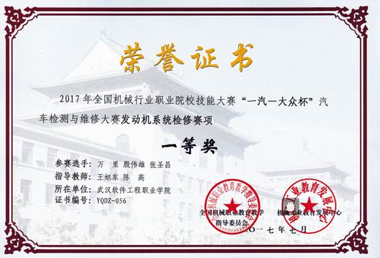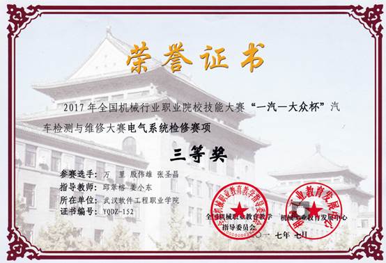 7月17-18日“2017年全国机械行业职业院校技能大赛-汽车类专业技能竞赛”在吉林省长春汽车高等专科学校举行,我校汽车工程学院学生万里、张圣昌、殷伟雄、余超、梅淦5位同学在汽车学院副院长曾鑫以及邱翠榕、谈丽华、陈高、王旭东、姜小东几位指导教师的的指导下,经过两天紧张激烈的竞赛,凭着扎实的理论功底和娴熟的专业技术,我校荣获“一汽大众杯”汽车检测与维修技能大赛一等奖、三等奖各一项,“汽车改装造型创新创意及装调技术大赛”二等奖一项。
