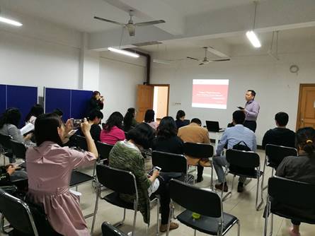 5月4日下午,综合楼208会议室,众多教师时而抬头倾听,时而点击手机,不时接耳交头。由我校和湖北生物科技职业学院、湖北城市建设职业技术学院共同举办的英语信息化教学改革研讨会在此举行。文华在线英语教学部经理周岩首先向与会老师展示了如何通过“雷课堂”软件制作个性化的教学课件及课堂测试题,以及基于“雷课堂”的教学模式,并就信息化在高职英语课堂的应用与老师们展开了热烈讨论。兄弟院校十余位英语老师参加了本次活动。