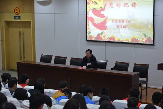 郭友鹏副书记的党课主题是《党的纪律》。他以“怎样做一名合格的党员”为主线,首先从“四讲四有”合格党员标准开始,结合中国共产党在不同历史发展阶段的党员发展工作特点,深入浅出地为大家讲解一名合格党员的重要标准。他指出,“作为一名党员,不能把自己当作普通的大学生,要做政治的明白人,不说糊涂话不做糊涂事,要关心党的地位、党的方针和党的各项重要政策。”