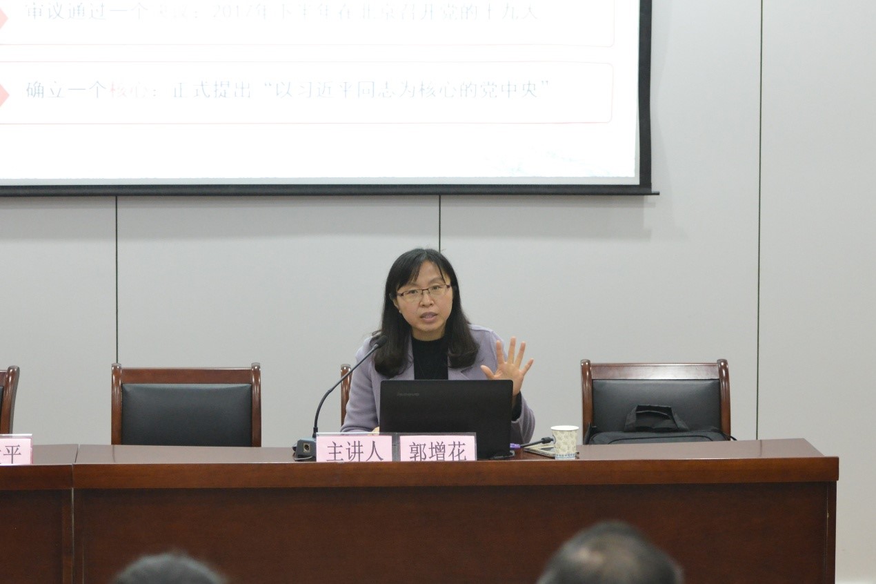 郭增花副教授首先从十八届六中全会的主要精神和重要成果入手,阐释了会议的重要意义。从从严治党、战略部署,依规治党、制度保障,长管长严、构建党建新常态三个维度架构起学习框架。她谈到,全面从严治党是一个战略举措,完善了“四个全面”的战略部署;提出“以习近平同志为核心的党中央”,确立了核心意识;《准则》、《条例》的制定,为从严治党提供了根本遵循。谈及从严治党战略意义,她指出,这是完善“四个全面”战略布局的需要,是深化全面从严治党的需要,这是解决党内存在突出矛盾和问题的需要。随后,她从党情、国情、世情的变化解读了《准则》、《条例》制定的背景,分析了党内政治生活出现的问题及表现,重点阐述了《准则》、《条例》的核心内容,并提出深刻理解和把握贯彻落实的基本要求。她强调,《准则》、《条例》是把坚定理想信念作为严肃党内政治生活的首要任务,聚焦“关键少数”,率先垂范、躬身践行;净化党内政治生态的重要抓手。最后,她以全会号召一以贯之,指出全党同志要认真学习领会、坚决贯彻落实党的十八届六中全会精神,进一步增强“四个意识”特别是核心意识、看齐意识,更加紧密地团结在以习近平同志为核心的党中央周围,更加坚定地维护以习近平同志为核心的党中央权威,更加自觉地在思想上行动上同以习近平同志为核心的党中央保持高度一致,更加扎实地把党中央的各项决策部署落到实处。