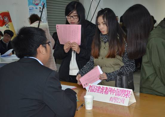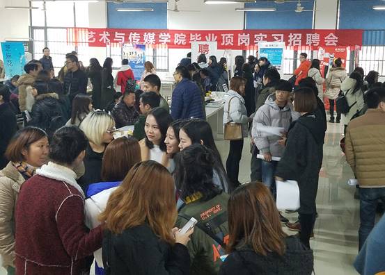 11月25日上午,二号实训楼人声鼎沸,由艺术与传媒学院举办的2014级学生顶岗实习招聘会在这里火热举行。来自服装与服饰设计、环境艺术设计、影视动画、艺术设计(广告设计与制作方向)、产品艺术设计、园林工程技术专业的380多名大三学生参加了招聘会,其中服装与服饰设计专业的110余名学生被虎都、九牧王、劲霸、达利、凯润五家知名服装企业一抢而空。