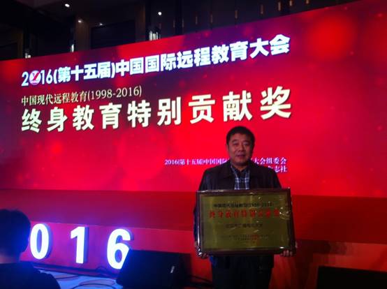 开幕式上,中国现代远程教育(1998-2016)“终身教育特别贡献奖”颁奖典礼同期举行。本奖项评选活动由《中国远程教育》杂志社和中国国际远程教育大会组委会主办,旨在表彰十余年来为中国现代远程教育发展做出突出贡献的院校和教育机构,嘉奖它们在终身教育和学习型社会建设中发挥的巨大作用。评选对象为在1998-2016年十余年来对推动中国现代远程教育发展,促进全民终身学习有着突出贡献的院校和教育机构。评选活动不接受任何机构的协办及赞助,不收取费用。经过提名、填报资料、审核和评选组委会确定等环节,我校荣获“终身教育特别贡献奖”。
