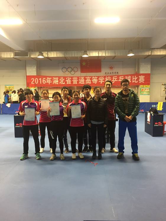 而在前不久落幕的2016年湖北省高等学院乒乓球(学生组)比赛中,我校乒乓球队同样表现不俗,在教练员窦少文、赵振银老师的指导下,荣获丙组女子团体第三名、男子单打第五名、女子单打第五名。
