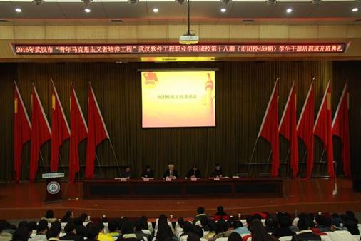 (通讯员 王席)2016年11月22日下午18:00,“青年马克思主义者培养工程”武汉软件工程职业学院团校第十八期(市团校459期)学生干部培训班在学术楼一号报告厅隆重开班。开班仪式由万国邦副校长主持,校党委书记胡大平、市团校陈宏校委分别在开班仪式上对同学们寄语,校团委尤小波副书记说明了本期青马工程培训班学习课程和学习要求。团市委代表、市团校老师、校团委指导老师、各学院团总支书记、教工团支部代表、思政教研室老师代表、校院两级学生干部390人参加了开班仪式。
