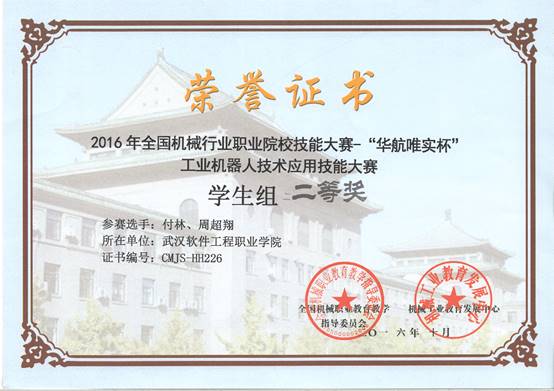 10月27日,我校机械学院代表队在潍坊参加2016年全国机械行业职业院校技能大赛——“华航唯实杯”工业机器人技术应用技能大赛,机自1402班的付林、周超翔同学凭借熟练的操作技能和良好的心理素质,力克对手,取得了学生组二等奖,团体三等奖的好成绩。