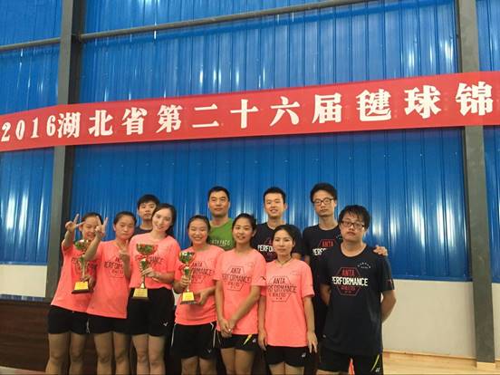 2016年湖北省第二十六届毽球锦标赛,经过五天激烈争夺,于7月24日在武当山国际武术学院结束。最终,我校毽球代表队获得男子双人赛冠军,女子三人赛、双人赛亚军,女子单人赛季军,男子双人赛、混合双第四名,男子单人赛第六名。成为本次比赛的最大赢家。