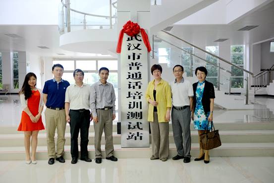 仇飙调研员宣读了关于设立“武汉市普通话培训测试站”的文件。省语委办主任曾彦和省测试中心常务副主任曹艳丽向我校授予“武汉市普通话培训测试站”牌匾。