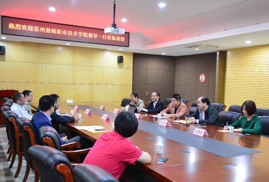 5月9日上午,苏州健雄职业技术学院副院长张学军,联合研究院院长、合作教育处处长周三庆,软件与服务外包学院院长杨正校,示范院校建设办公室主任张敏珠,软件技术专业负责人吴伶琳等一行5人来访我校,马蜂校长和相关部门负责人一起接待了来宾。
