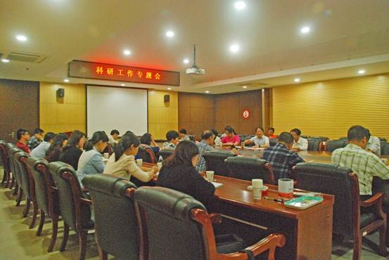 (通讯员:王燕)5月12日下午,我校科研工作专题会在学术报告厅二楼会议室召开。会议的主题是总结“十二五”,对接“十三五”,推动科研工作再上新台阶。校党委胡大平书记,科研处处长毛新华、副处长李红艳以及来自各学院(部门)的科研负责人、科研联络员, 30余人参加了会议。