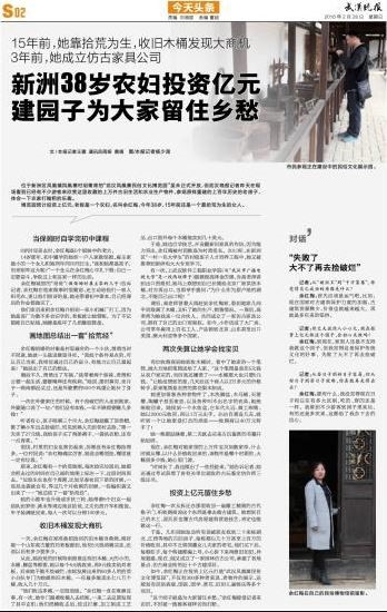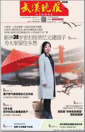 2月28日,《武汉晚报》以《新洲38岁农妇投资亿元建园子为大家留住乡愁》为题,头版头条报道了武汉市广播电视大学新洲分校“一村一名大学生”村级班子人才培养工程大专班学员余红梅的创业故事。报道讲述了余红梅从一个靠拾荒为生的女人成长为身家数千万的公司董事长的创业经历,并投资亿元搭建古园,为大家留住乡愁。电大学习期间,在我校副教授高泽金老师的细心指导下,她利用学到的专业知识,将自己公司的产品进行重新定位、产业升级,不但走向全国还出口到美国、澳大利亚等多个国家。