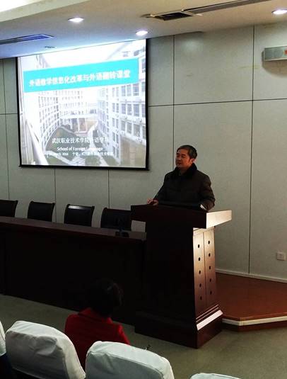 (通讯员 王九程) 3月10日,武汉职业技术学院外国语学院院长、教育部职业院校外语类教学指导委员会委员宁毅教授受邀为人文学院全体教职工作了题为“外语教学信息化改革与外语翻转课堂”的精彩学术报告。