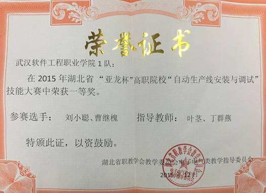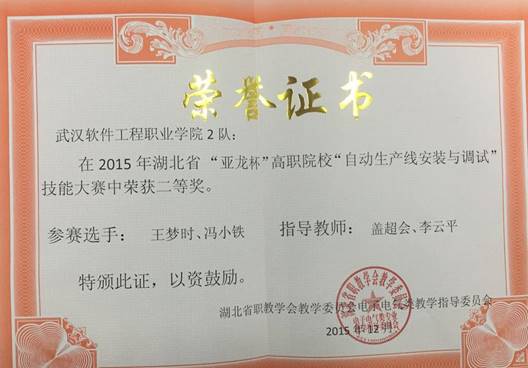 (通讯员:盖超会) 近日,在湖北省首届“亚龙杯”高职院校“自动生产线安装与调试”技能大赛中,我校组建的两支代表队分别获得一等奖、二等奖的佳绩。由电子工程学院学生刘小聪、曹继槐组建,叶茎、丁群燕老师指导的1队获得一等奖,王梦时、冯小铁组建,盖超会、李云平老师指导的2队获得二等奖。