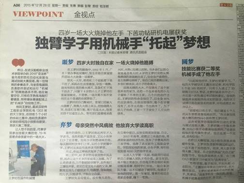 特别值得一提的是,参赛选手王梦时还是一名无左臂、重度烧伤的残疾学生,为取得参加比赛资格并获得好成绩,他付出了常人无法想象的努力,除吃饭睡觉外,每天十四五个小时全泡在学习编程,在程序输入速度慢、调试单臂有障碍、和正常人同台竞技的情况下,获得了二等奖的好成绩。他的事迹也感动了新闻媒体,湖北经视、楚天金报、中国新闻网都对他作了专题采访和报道。