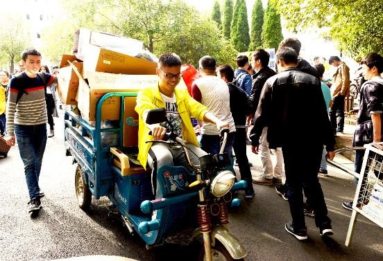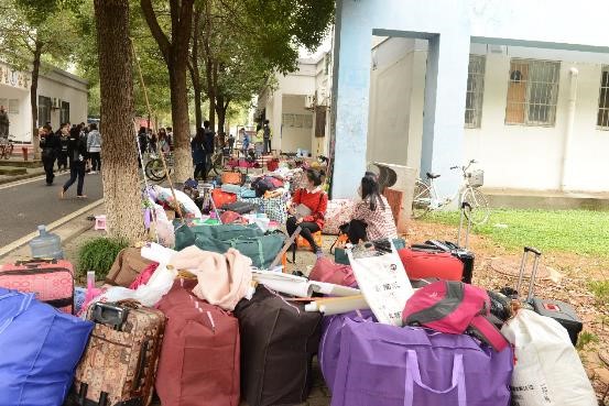 早上7点,搬迁行动正式开始。校领导亲临现场指导,各学院领导排兵布阵,校广播台温情地播报着搬迁盛况,由青年志愿者和学生干部们组成的“小蓝帽”、“小黄帽”堪称主力队员,以拖车快运速递,有的学院更是请来了电动车助力。男生帮女生搬,你扛被子我提桶,互助友爱随处见。上行线、下行线,全校按着预定的搬迁路线有序不紊地进行着。