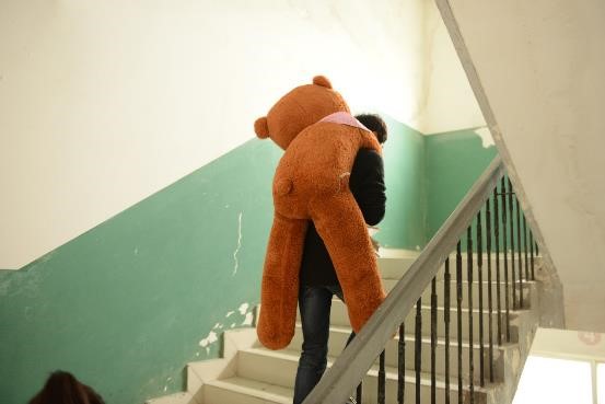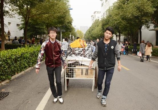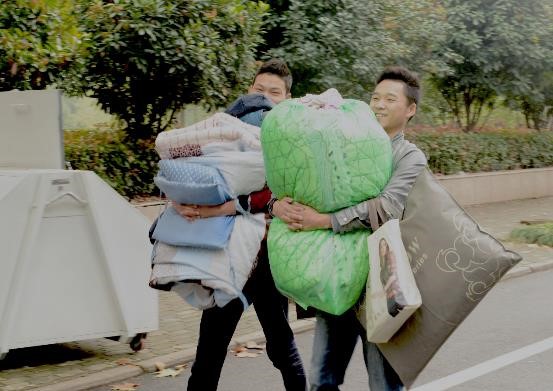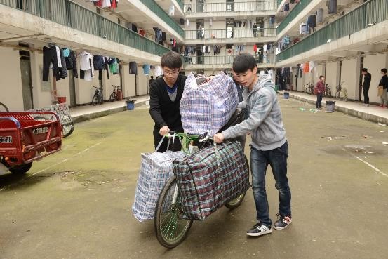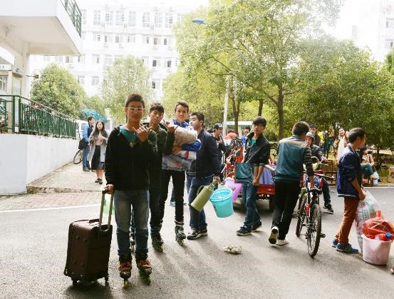 在搬迁过程中,同学们奇思妙想,能动性大增,将自行车改装成搬运车的已经不算时髦的,有人踩着轮滑轻松搬运的才算酷毙。在女生寝室,有不少身高一米五六的大熊,男生们只好背着熊搬家,萌萌哒,可爱又有爱。通过宿舍搬迁,女生们把班里的男生都改口叫“男神”了,“男神加油!”“男神们,大家辛苦了!”一时间,“男神”响遍楼上楼下,传递的是满满的团结与友爱。