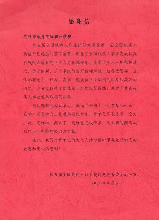 第五届全国残疾人职业技能竞赛筹委会办公室向我校致感谢信