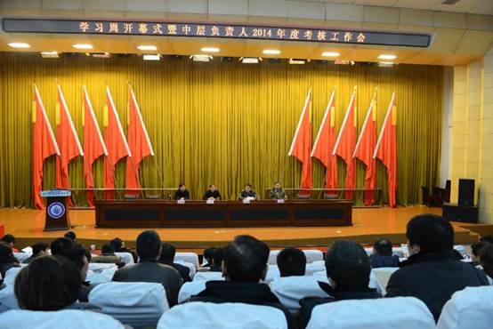1月23日上午9点,我校举办学习周开幕式暨中层负责人2014年度考核工作会,校党委书记胡大平、校长马蜂、党委副书记郭友鹏、副校长王路群出席会议,副科级以上干部参加会议。会议由马蜂校长主持。