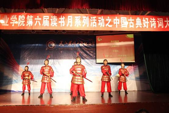 决赛分为诗词朗诵和抽签答题两个环节。各代表队伴着雄壮或柔美的音乐,用朗诵表演的形式把古诗词的韵律和意境展现给大家,诗词间传递着浓浓的古韵。抽签答题环节考查了参赛者对经典古诗词300句的掌握情况和现场应变能力。汽车学院代表队身着戎装,手持长剑,以一首气势磅礴的《燕歌行》,演绎出爱国将士英勇抗敌的万千豪情,参赛选手敏捷熟练的诗词对接,更是赢得满场的热烈掌声,最终勇夺朗诵表演和抽签答题的冠军。
