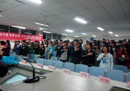 我校2014级心晴天使共计1482人,本次仪式由各班心理委员共计139人代表参加。首先心理中心主任金琼老师介绍了到场的领导和老师,介绍了心晴天使团及本次培训目的、意义,要求全体学员通过学习明白建立心理委员的意义、心理委员的性质、心理委员应具备的素质以及基本职责。2013级心晴天使团团长商学院刘萍同学,根据自己的经历,跟大家分享了从一个什么都不懂的高中毕业生到心晴天使团团长的心路历程,激励着新的“天使”们共同努力,共同奋斗。