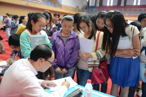在每个展台前,应聘的同学们都自觉地排起长队,拿着简历,认真地打量着企业信息与招聘信息,酝酿等待着属于自己的下一秒精彩。在本次招聘会上,吸引毕业生投简历的远不止企业提供的薪酬待遇。在百度在线的招聘展台前,人事专员贴心地介绍着,“对应届毕业生,我公司提供住宿,为大家解决前期发展的后顾之忧。”话音刚落,几个同学又踮着脚递上了自己的简历。在体育馆的舞台边上,计算机学院几个刚刚聚焦武汉达内软件有限公司的同学正认真地填写着《职位申请表》,他们表示,专业对口是他们择业的首要因素。在红鼎豆捞的展台前,环化学院的小周同学鼓足勇气,在简历上锁定填上“客户经理”,这也是她今天投递的第一份简历,学习应用化工技术专业的她坦陈,虽然今天的招聘会并没有她们相关的专业,但是学生干部的经历让她有足够的自信去挑战一些管理类的岗位。