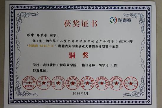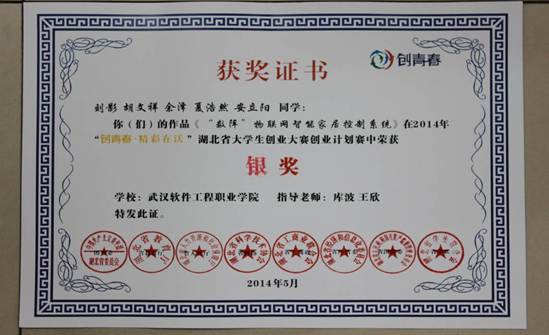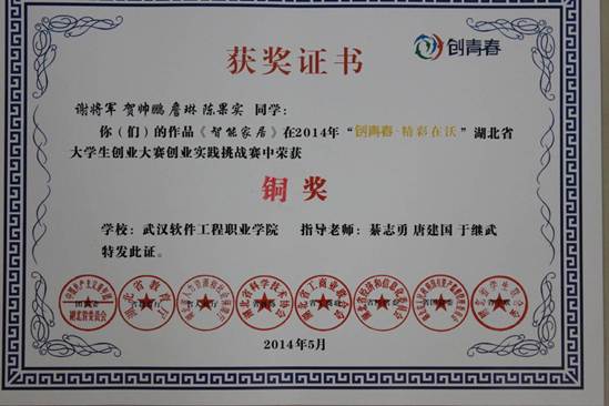 (通讯员 宋晶晶 )由共青团湖北省委、湖北省教育厅、湖北省人力资源和社会保障厅等单位联合主办的2014年“创青春·精彩在沃”湖北省大学生创业大赛结果已于5月28日揭晓,校团委从全校20余件优秀作品中挑选报送了8件作品,其中计算机学院作品《“数阵”物联网智能家居控系统》喜获银奖,机械学院作品《大别山黄牛生态养殖综合发展项目》、《金色足迹婚庆礼仪服务有限公司》、计算机学院作品《智能家居服务系统》、电子学院作品《一号报亭快递小站》、汽车学院作品《小型全制动杀鱼机的生产和销售》获得铜奖,我校团委荣获“优秀组织单位奖”。