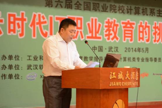 大连东软信息学院校长温涛教授,教育部行业职业教育教学指导委员会工作办副主任王国川,工信部通信职鉴中心主任、工业和信息化职业教育教学指导委员会委员滕伟,广东科学技术职业学院软件学院院长余爱民等专家分别做了精彩的主题报告;Intel公司的姜涛、联想集团的王晓斐等来自IT知名企业的代表也从多角度就云时代IT职业教育面临的挑战与机遇进行了演讲。我校计算机学院院长助理罗保山以“湖北省中高职衔接计算机应用技术专业教学标准建设的研究”为题作主题发言。