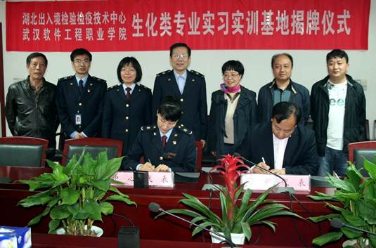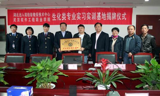 4月18日 上午10:30,我校“生化类专业实习实训基地”揭牌仪式在湖北出入境检疫检疫局检验检疫技术中心会议室举行,作为环境与生化工程学院与湖北出入境检验检疫技术中心的校企合作项目正式启动。