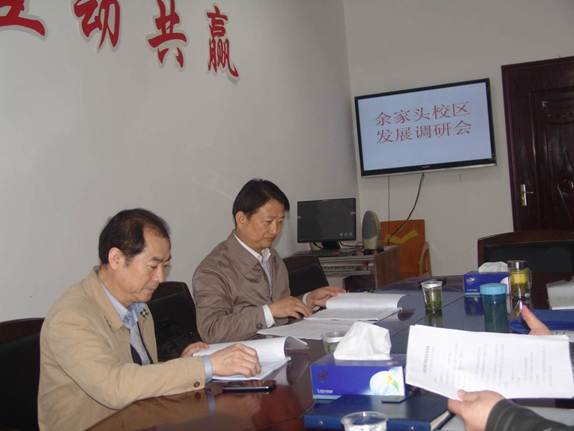 两位校领导首先查看了校区的办学环境、条件、设备等基本情况,然后听取了继续教育学院负责人夏毅关于“余家头校区现状及发展思路”的汇报。继教学院总支书记冯芳亮、副院长周世游也参加了汇报发言。