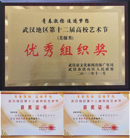 (通讯员 陈兵)近日,由武汉文化新闻出版广电局、武汉市洪山区人民政府联合主办的武汉地区第十二届高校艺术节在武汉市群艺馆落下了帷幕。我校艺术与传媒学院在此次活动中推荐了22件优秀学生艺术作品参赛,经过专家的评审,9件艺术作品在20余所高校推荐的300余件参赛作品中脱颖而出,获得了5个金奖、4个银奖的好成绩。我校获得“优秀组织奖”,陈兵老师、袁继涛老师获得“优秀辅导奖”。