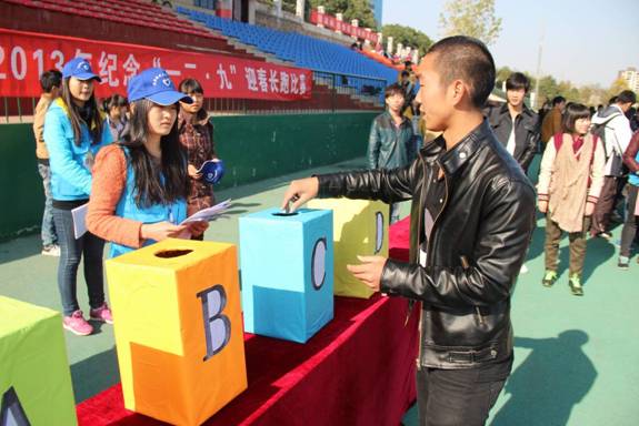 本次比赛分为爱国知识竞答和长跑两个环节。爱国知识竞答环节中每名参赛选手需抽签回答5题,每答对一题则在长跑环节的总成绩中减去12.9秒作为奖励;长跑路线遍及校园,途中设置黄、绿、蓝3条象征着“和平、感恩和健康”的彩带采集点,全程最长约2500米。发令枪响后,起跑线上的选手们迎着阳光,伴着寒风冲了出去。赛前,同学们摩拳擦掌,相互鼓劲;赛中,同学们你追我赶,坚持不懈;赛后,同学们嘘寒问暖,你帮我扶。
