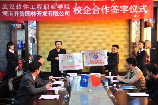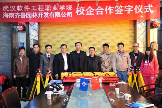 (文/侯永胜、图/陈兵、余刚)11月25日下午,在艺术与传媒学院会议室,副校长王路群代表我校与海南齐鲁园林开发有限公司人事部经理夏鹏先生共同签订了校企合作办学协议书,并互赠了牌匾。夏鹏经理代表该公司向我校捐赠了价值3万余元的水准仪、经纬仪等地形测量仪器设备。校企合作处处长龚平、教务处副处长龚涛、实习实训中心副主任刘颂、艺术与传媒学院院长陈天荣、书记王鹰,以及园林技术教研室教师与学生代表出席了本次仪式。