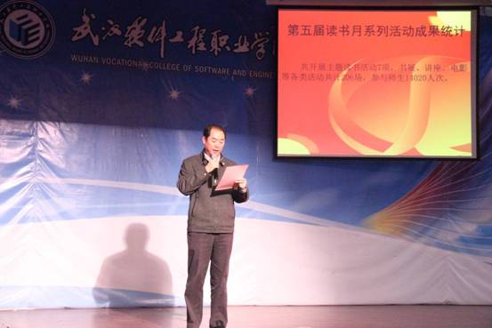 郑瑛副校长的致辞,为本届读书月活动划上一个圆满的句号。他总结说,本届读书月从11月14日正式启动至今,以 “凝聚梦想 阅享人生”为主题,共举办“武软校园阅读排行榜”、“爱心捐赠图书行动”、“武软阅读广场”、微书评大赛、“经典名著品鉴”、 “艺术赏书活动”、“中国梦 我的梦”演讲比赛等主题活动7项,书展、讲座、电影等各类活动共计206场,直接或间接参与师生达14020人次。他赞扬道,本届读书月活动形式更新,气势更盛,追求更实,特别注重创新和铸造精品,特别注重学生的参与互动,特别关注大家的阅读需求,特别注重构建积极价值理念。郑瑛副校长向所有老师和同学呼吁,让我们携手努力,手捧书卷,沐浴心灵,从读书中感受快乐,凝聚力量,从而成为更文明、更优雅的武软一员,开始自己阅享人生之旅。