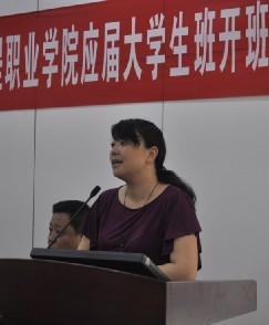 市人力资源和社会保障局东湖新技术开发区分局科长王虹在典礼上致辞。她首先感谢学校领导对大学生创业的支持,同时也感谢同学们的坚持,她希望同学们可以珍惜本次培训的机会。
