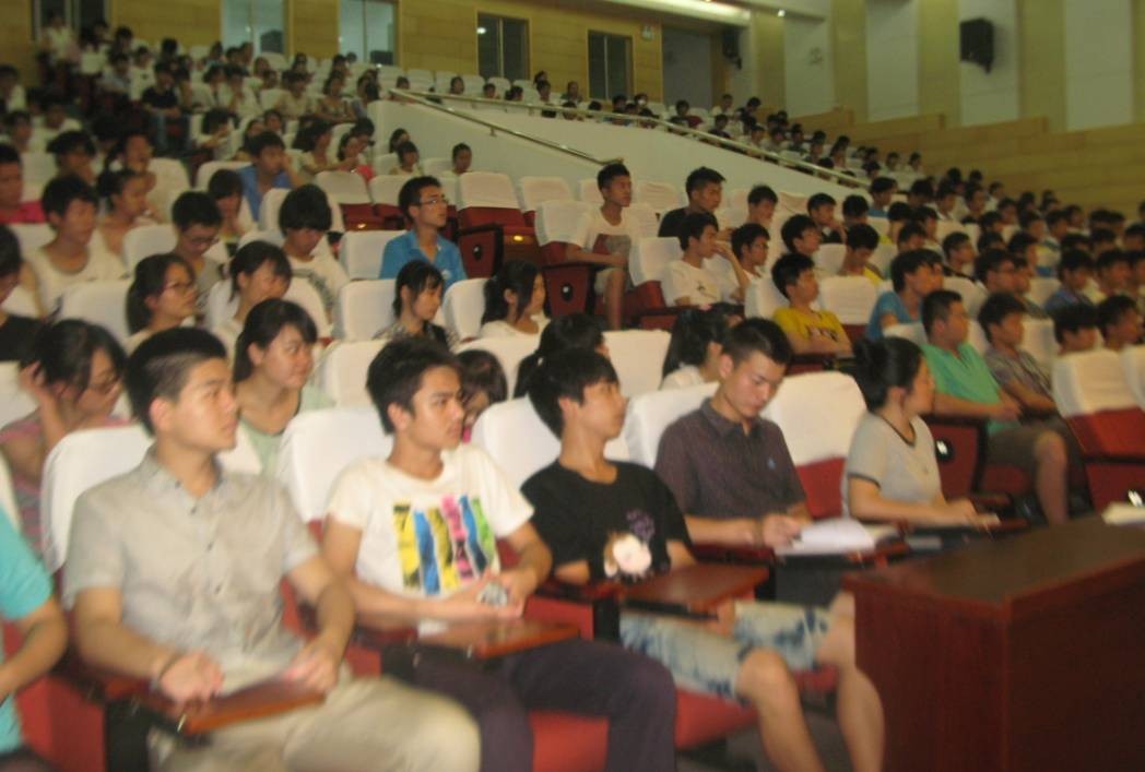图为各系部近300名学生在学术报告厅认真听讲座