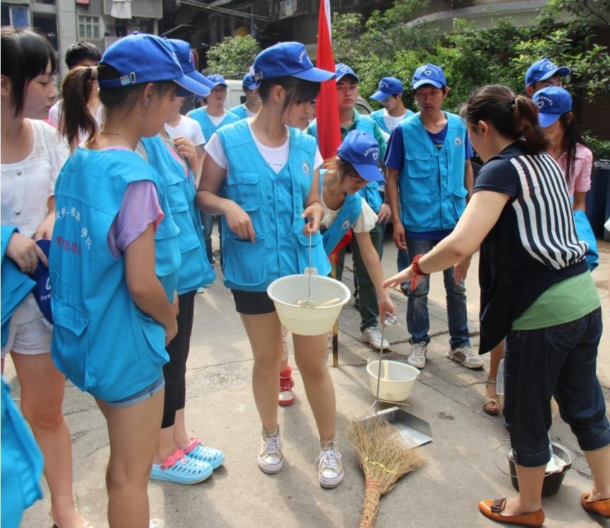 仪式结束后,我校青年志愿者深入硚口区荣华街中山社区,开展了环境卫生清扫志愿服务。炎炎夏日中,他们清扫卫生死角,清理楼道杂物,清洗油污路面,他们身上的蓝色马甲成为社区最亮丽的风景。社区群众对我校志愿者们赞不绝口,并为他们送上矿泉水。团市委领导也我校志愿者给予高度评价,称赞他们用自己实际行动吹响了“双创”冲锋号。