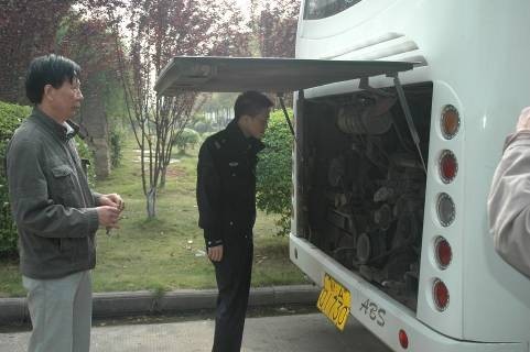 会前,东新大队车管科李警官对我校车辆,特别是大客进行了安全检查。
