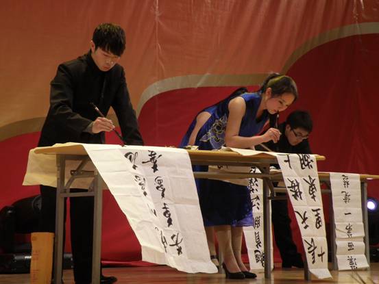 我校书法协会和汉艺苑协会表演配乐书法《爱我江城》