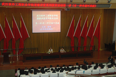 9月13日下午,由校团委主办,计算机与软件学院承办的“道德讲堂系列教育活动”在我校学术报告厅举行了第一场讲座。讲座嘉宾正是武汉城市精神代言人、全国道德模范、我校青年教师董明。校党委副书记戴向军、校团委书记黄俊亮、计算机与软件学院领导出席讲座,数百名师生聆听了报告。