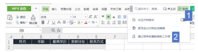 先输入要填写的内容标题,再依次单击右上角【协作】→【通过表单收集数据到工作表】。