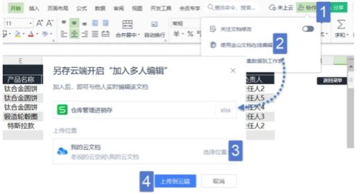 单击右上角的【协作】→【使用金山文档在线编辑】命令,选择保存位置,【上传到云端】。