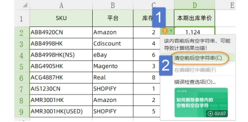 选中带有标记的数据区域,单击【错误检查】按钮的小三角,再从下拉菜单中选择【清空前后空字符串】。