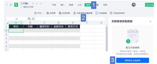 再依次单击【协作】→【关联表单收集数据】→【使用表头生成表单】。